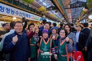 미디어라이프 중부신문 이종인 기자 | 이재명 대통령은 30일 오후 제주 타운홀미팅 '제주의 마음을 듣다' 종료 후, 김혜경 여사와 함께 1박 2일 제주 일정의 마지막 일정으로 동문시장을 방문했다. 동문시장은 제주시 도심에 위치한 대표적인 전통시장으로, 대통령 부부의 방문 소식에 상인들과 방문객들은 놀라움 속에 환호와 박수로 이들을 맞이했다. 입구에 서 있던 한 외국인 관광객은 어디서 왔냐는 이 대통령의 질문에 “오스트레일리아”고 답하기도 했다. 이 대통령 부부는 셀카촬영과 악수를 이어가며 과일모찌 가게에 들러 온누리상품권으로 한라봉모찌와 딸기모찌를 구입해 즉석에서 강유정 대변인, 하정우 수석 등과 함께 시식했다. 이동 내내 이어지는 셀카요청에도 이 대통령 부부는 반갑게 응했다. 그러자 시장을 찾은 많은 도민들은 이동 중인 이 대통령 부부를 향해 "사랑해요", "와 대박", "화이팅"을 외치는 소리로 화답했다. 이 대통령은 특히 어린이들의 사진 요청에 적극적으로 답했다. "애기 있어요"라는 소리가 들리면 발걸음을 멈추고 아이들과 하이파이브를 하거나 반갑게 셀카를 찍었다.