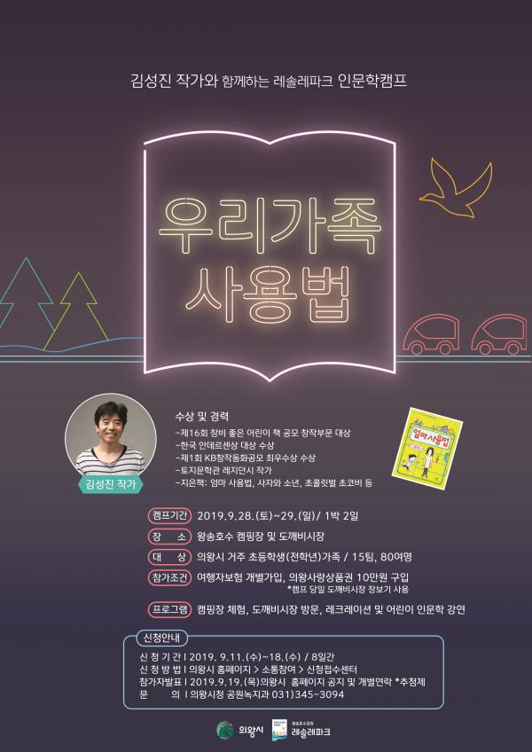 김성진 작가의‘우리가족 사용법’인문학 프로그램을 비롯해 왕송호수 캠핑장 체험, 도깨비시장 방문, 레크레이션 등 가족들이 함께 소통하며 즐길 수 있는 시간이 마련돼 있다.