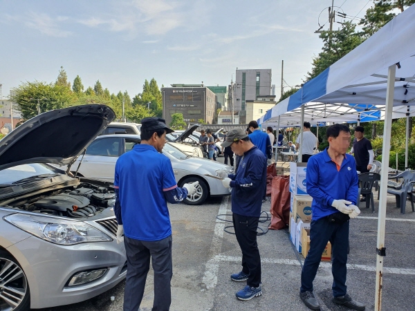 오전 9시 30분부터 오후 3시 30분까지 실시된 이날 무상점검에서는 차량의 불량 와이퍼, 전조등·브레이크 등의 전구 무상교체, 부족한 워셔액· 냉각수 보충 등 소모품을 교체 또는 보충해 줬으며, 조향·제동·주행 장치, 배터리, 타이어 등의 이상 유무를 살펴보는 등 안전 점검을 하고 정밀 점검이 필요한 차량은 점검 내용을 발급해 정비를 받도록 안내했다.