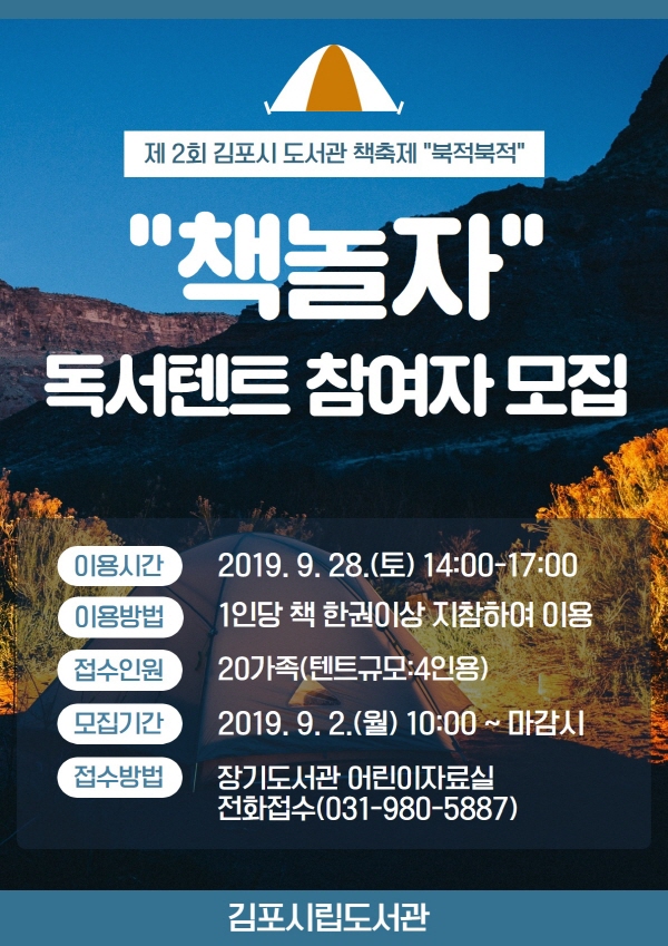 독서의 계절 가을을 맞아 책읽기를 즐기고자 하는 김포시민들을 위해 ‘책 놀자’ 읽는 마당에서는 독서텐트 20동을 설치해 가족들이 텐트에서 독서를 하며 축제를 즐기는 색다른 경험을 할 수 있도록 할 계획이다.