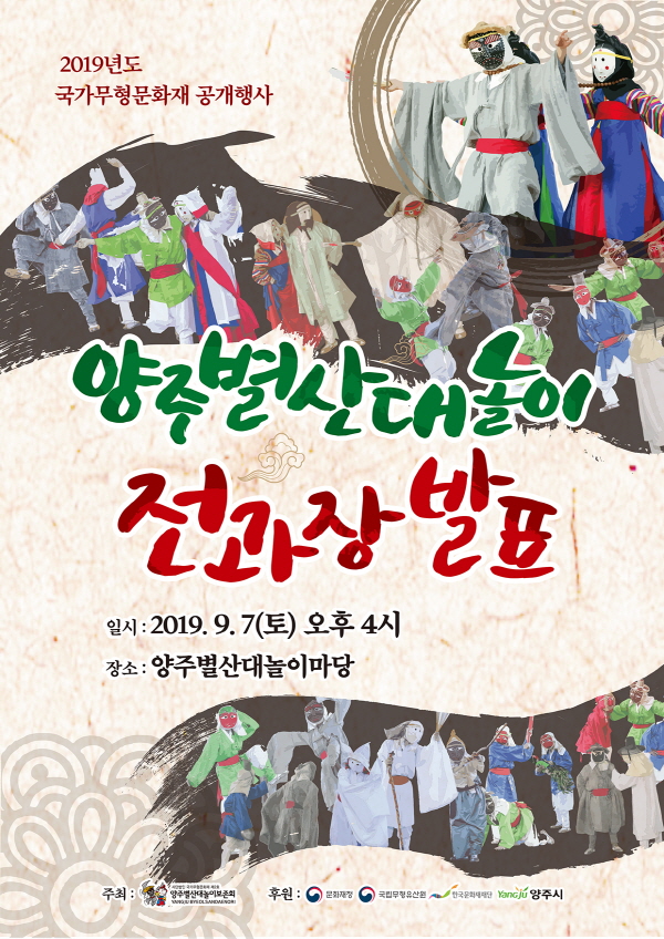 사단법인 국가무형문화재 양주별산대놀이보존회는 오는 7일 오후 4시 양주별산대놀이마당 소공연장에서 2019년 국가무형문화재 공개행사인 ‘양주별산대놀이 전과장 발표’ 공연을 진행한다.