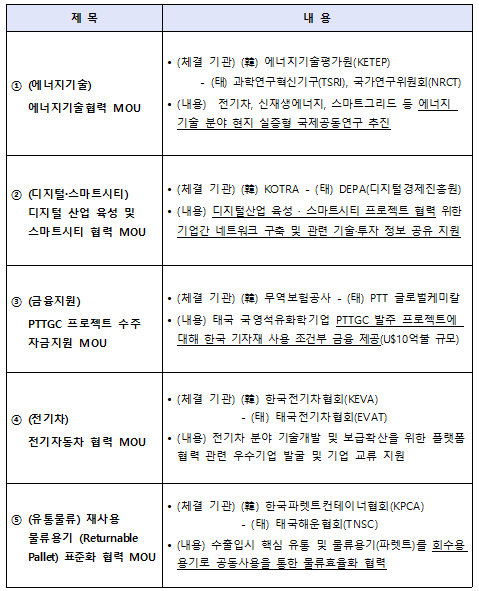 이번에 체결된 MOU를 통해 전기차·스마트그리드·ICT·스마트시티 등 미래 신산업 분야에서 한-태 양국간 다양한 협력사업들이 본격 추진될 것으로 예상되며, 태국 국영석유공사가 추진하는 석유 및 가스 프로젝트에 우리기업 참여 기회를 확대하고, 유통물류 용기 표준화를 통한 물류 효율화 등 협력사업도 추진될 것으로 기대된다.