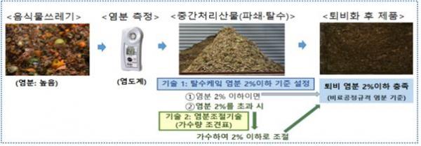 염분 조절 방법은 우선, 음식물쓰레기의 염분을 간이염도계로 측정하고, 가수량 산정표의 물량을 첨가하여 탈수하면 최종 퇴비의 염분 기준 2% 이하로 효율적으로 맞출 수 있다.
