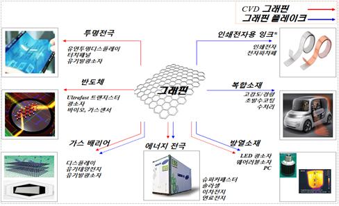 그래핀은 탄소가 0.2나노미터 두께 벌집모양의 단층 평면구조로 결합된 나노 물질로 전도성이 구리보다 약 100배 뛰어나고, 열전도성은 다이아몬드의 2배 이상으로 초고속 반도체, 디스플레이, 태양전지, 2차전지 등에 사용되는 첨단소재다.