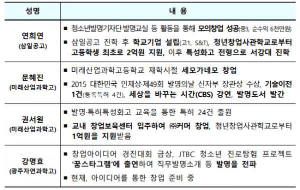 일례로 발명·특허 특성화고 졸업생 연희연씨는 고등학교 재학시절 직접 개발한 발명교구를 특허 등록하고, S&T 스튜처를 창업하여 청년사관학교에 고등학생 최초로 입학하는 등 아이디어와 특허 기술을 바탕으로 창업가의 길을 걷고 있다.