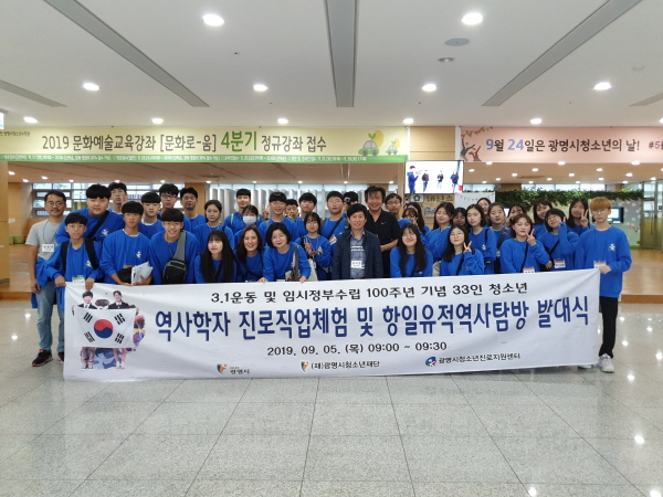 ‘광명시 33인 청소년, 역사학자 진로직업체험 및 항일유적역사탐방’은 광명시가 3.1운동 및 임시정부수립 100주년을 기념해 미래의 주역인 청소년들이 역사에 대한 올바른 인식을 가짐으로써 미래를 준비하고 진로를 결정하는데 도움을 주고자 마련됐다.