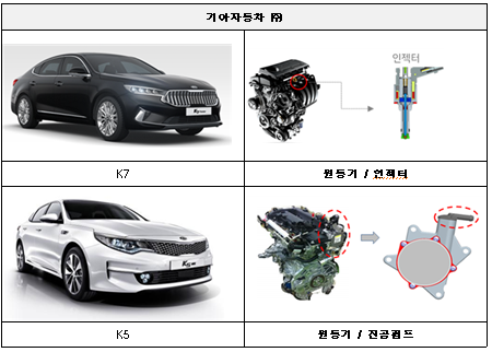 첫째, 기아자동차에서 제작 판매한 K7차량 5,729대는 엔진 인젝터 끝단 연료 분사량을 조절하는 볼의 제조불량으로 연료가 과분사되어 시동지연, 울컥거림 및 주행중 간헐적으로 시동꺼짐 현상이 발생하여 안전운행에 지장을 줄 수 있음이 확인됐다.