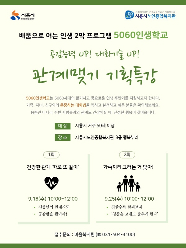 5060인생학교 프로그램의 일환으로, 9월부터 원활한 의사소통을 위한 ‘관계 맺기 특강’을 운영할 계획이다. 관계 맺기 기획특강은 가족뿐만 아니라 주변 사람과의 관계에서 서로 다름을 이해하며, 5060세대의 건강한 대인관계를 유지할 수 있도록 하는 전반적인 관계 맺기에 대한 내용으로 구성돼 있다.