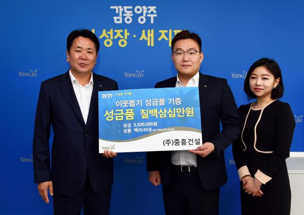 김용훈 국장은 “어려운 경기 속에서도 기부를 통한 사회공헌 활동에 앞장서주시는 중흥건설에 감사하다”며 “기부해주신 성금과 백미는 관내 저소득층 등 취약계층에 잘 전달해 소외된 이웃이 없도록 적극 힘쓸 것”이라고 밝혔다.