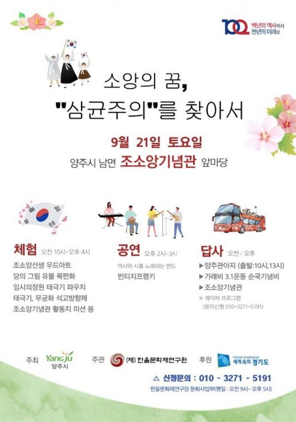 아울러, 3·1운동 만세시위지 중 하나인 양주관아지에서 출발, 가래비 3·1운동 순국기념비를 경유해 조소앙기념관으로 도착하는 ‘3·1운동 만세시위지 답사프로그램’을 사전 예약을 통해 오전 10시와 오후 1시, 총 2회 운영한다.