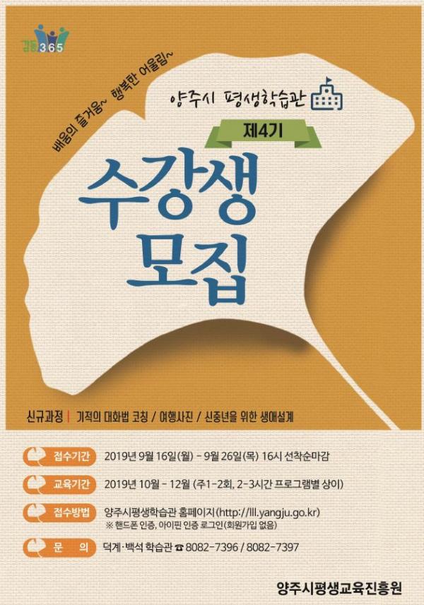 수강신청은 오는 16일부터 26일 오후 4시까지 양주시 평생학습관 홈페이지를 통해 선착순으로 접수한다.