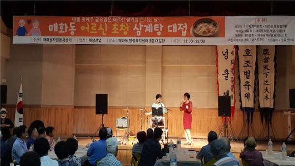 조철재 매화동장은 “삼계탕 봉사를 후원해준 매화산단 입주업체 및 자원봉사센터를 비롯한 유관단체 회원들에게 궂은 날씨에도 음식 준비에 애써 주셔서 감사드린다”며 “어르신들이 건강하고 즐거운 추석명절을 보내시길 바란다“고 전했다.