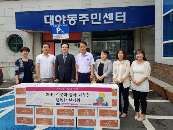 사)국제위러브유운동본부에서 후원한 식료품 세트 안에는 사골곰탕, 미역국, 즉석밥, 영양죽, 라면, 등 간편식과 참기름 식용류 등 생활에 필요한 식재료가 들어 있다. 본 후원물품은 사회복지공동모금회에 지정기탁으로 후원되어 대야동 지역 대상자에게 전달 될 예정이다.