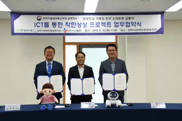 시는 10일 양주시장애인종합복지관, CJ헬로와 첨단 ICT를 통한 착한상상프로젝트 ‘장애인과 가족의 친구 스마트봇 감동이’ 사업의 성공적인 수행을 위한 업무 협약식을 개최했다.
