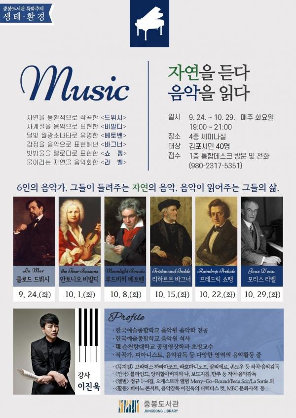 ‘자연을 듣다, 음악을 읽다’는 중봉도서관의 특화주제인 생태·환경과 음악·예술 분야를 결합한 복합 주제 프로그램으로, 한국예술종합대학교 음악원에서 음악학을 전공하고 클래식, 재즈, 뮤지컬과 같은 공연·예술 및 교육 등 다양한 영역에서 음악 활동을 하고 있는 이진욱 음악가가 진행한다.