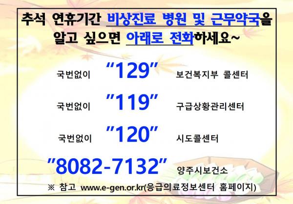 응급환자에 대한 상담과 진료안내 등은 양주시 보건소나 보건복지콜센터, 119구급상황관리센터, 시도콜센터를 이용하면 안내받을 수 있다.