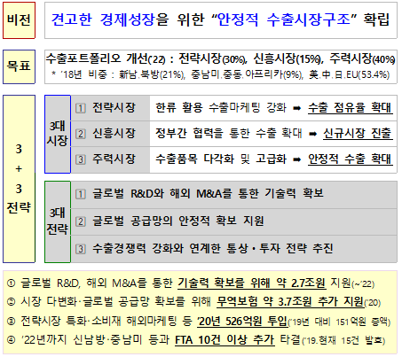 이번 대책은 미·중 무역분쟁, 일본의 수출규제 강화 등 최근 세계 무역환경의 불확실성이 지속되고, 우리 수출이 9개월 연속 감소하고 있는 상황에 대한 엄중한 인식하에, 세계 시장별 특성을 고려하면서 통상·투자·산업·기술협력 등을 통한 ‘종합적 수출경쟁력 강화 전략’의 일환으로 마련되었으며, 수출시장 다변화를 통해 ‘고성장·고위험’의 수출구조를 ‘고성장·저위험’의 수출구조로 전환하여 제2의 수출도약을 모색하고, 우리나라가 글로벌 공급망 재편에 적기 대응함은 물론 전기차, 수소경제 등 4차 산업 분야에서 새롭게 형성되고 있는 글로벌 공급망을 주도하기 위한 것이다.