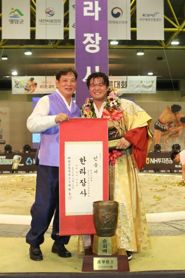 지난 10일부터 15일까지 전라남도 영암군에서 개최된 ‘2019 추석 장사씨름대회’에서 박정진 선수는 한라급 장사결정전에서 김민우 선수에게 첫판을 내주고도 내리 세 판을 따내며 3대 1로 짜릿한 역전승을 거두고 꽃가마를 탔다. 이로써 박 선수는 2009년 실업 무대 데뷔 이후 10년 만에 처음으로 한라급 최강자 타이틀을 차지하는 기쁨을 누렸다.