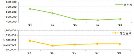 2018년 원양어업 전체 생산량은 46만 2천 톤으로서 전년보다 6.0% 증가하였으나, 주요 어종의 어가 하락으로 생산금액은 0.4% 감소한 것으로 나타났다.