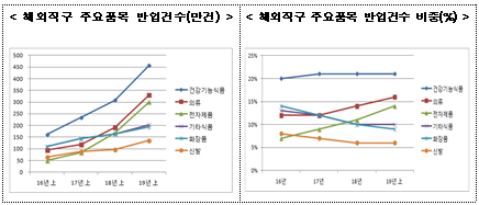 유럽은 2018년 상반기 189만건·2억5천만불에서 2019년 상반기 257만건·3억5천만불로 건수 36%, 금액은 39% 증가했고 일본은 2018년 상반기 126만건·9천만불에서 2019년 상반기 159만건·1억불로 건수 26%, 금액은 20% 증가한 것으로 나타났다.