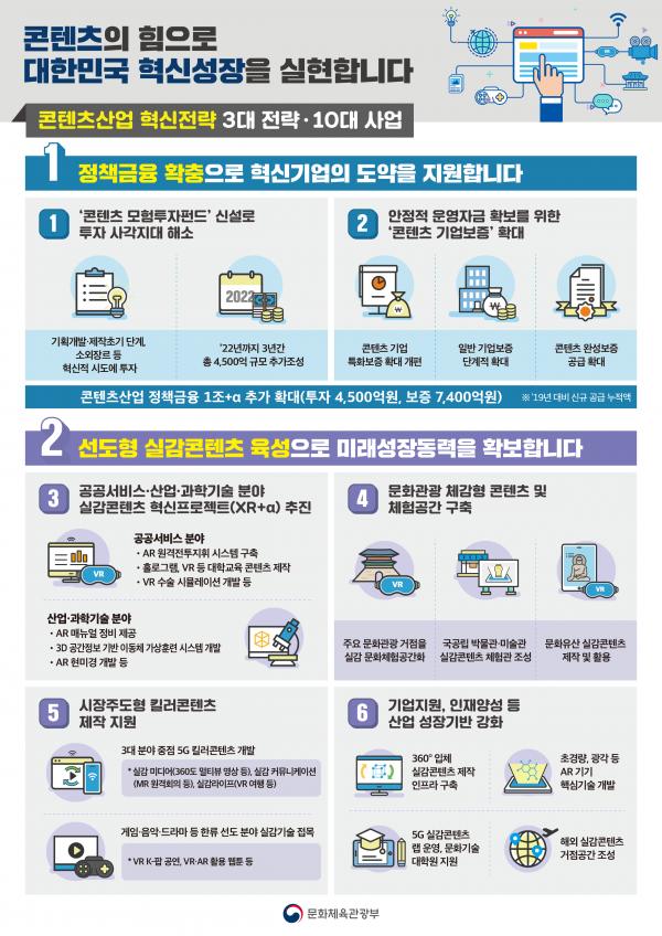 이에 정부는 지난해 12월 콘텐츠산업 중장기 종합계획인 ‘콘텐츠산업 경쟁력 강화 핵심전략’을 발표한 이후, 추가적으로 필요한 핵심요소 중심으로 이번 ‘콘텐츠산업 3대 혁신전략’을 마련했다. 이를 통해 환경 변화에 대응하여 콘텐츠산업을 키우고, 연관 산업의 동반성장을 이끄는 우리 경제의 새로운 돌파구로 삼는다는 전략이다.