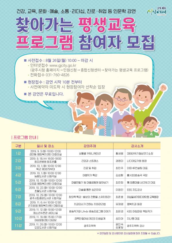 ‘찾아가는 평생교육’은 지난 3일 경안동행정복지센터에서 열린 황세웅 대테러위기협상연구소장의 ‘상황별 커뮤니케이션’을 시작으로 오는 11월 26일까지 ‘건강과 스트레스’, ‘진로 및 취업’, ‘여행작가 특강’ 등 다양한 주제의 강연을 참조은병원, 능평도서관 등 다양한 장소에서 총 11회 개최한다.