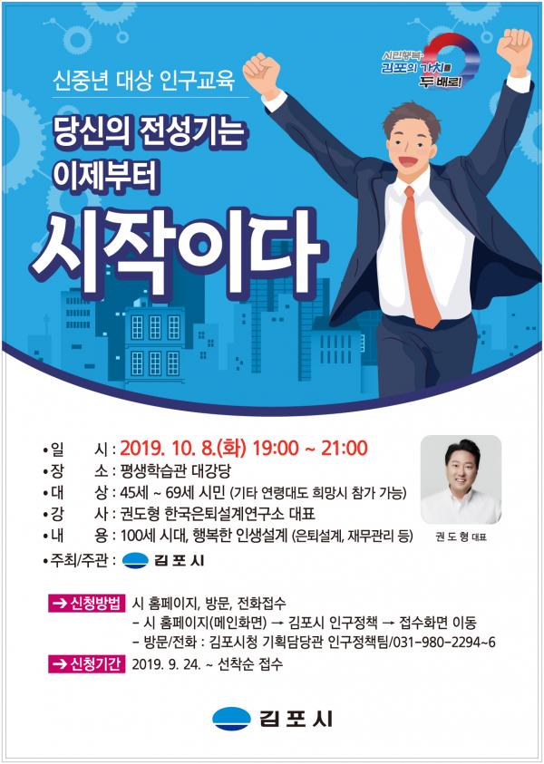 은퇴설계교육으로 유명한 한국은퇴설계연구소 권도형 대표의 강연으로 진행되는 이번 교육은 ‘당신의 전성기는 이제부터 시작이다’ 라는 주제로 은퇴설계와 재무, 비재무설계 등에 대한 내용을 다룰 예정이다.
