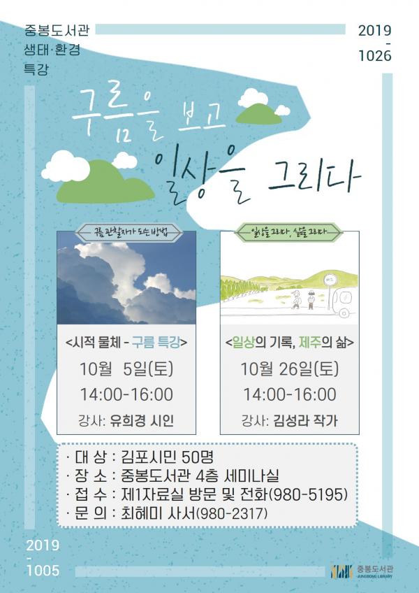 ‘구름을 보며, 일상을 그리다’는 중봉도서관의 특화주제와 관련 있는 소재들을 주제로 시적 강연 및 작가와의 만남을 진행할 예정이다.
