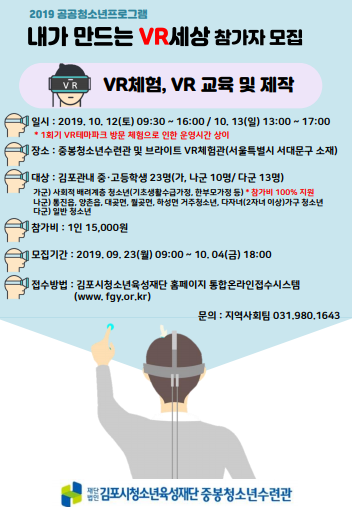 프로그램 모집기간은 9월 23일부터 10월 4일까지며 접수는 김포시청소년육성재단 홈페이지 통합온라인 접수시스템을 통해 접수 할 수 있다.