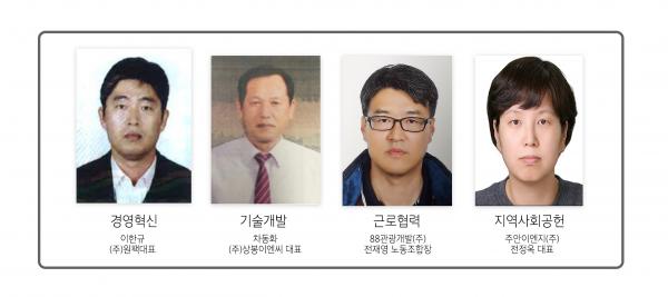 수상자는 경영혁신 부문의 이한규 ㈜원팩 대표, 기술개발 부문 차동화 ㈜상봉이엔씨 대표, 근로협력 부문 88관광개발 노동조합, 지역사회공헌 부문 주안이엔지 등이다.