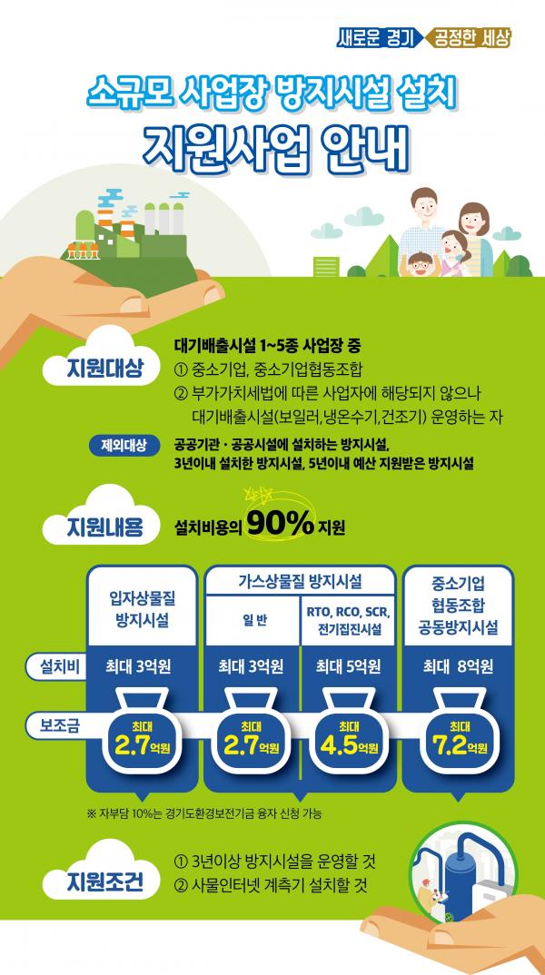 지원대상은 중소기업 중 대기배출시설 1~5종 사업장이며, 대기방지시설 개선 및 설치비용의 90% 지원한다.