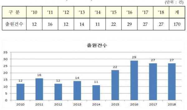 이를 출원인별로 보면, 내국인이 142건, 외국인이 28건으로 내국인이 특허출원을 주도하고, 외국인 중에는 일본이 14건, 미국이 6건으로 그 뒤를 따랐다.