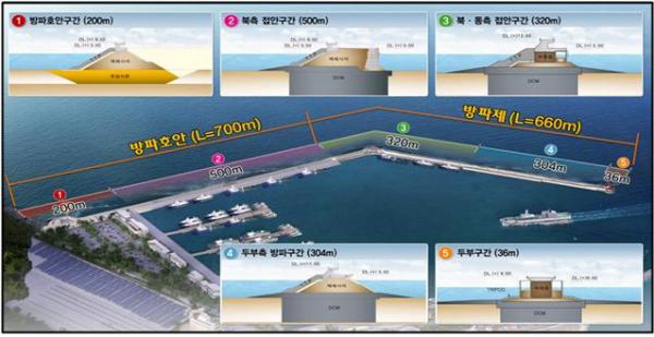 이번 공사에서는 월파 방지 및 정온수역 확보를 위해 기존 방파제보다 5m 이상 높은 방파제를 시공하였으며, 내진설계를 통해 구조물의 안정성을 확보했다.