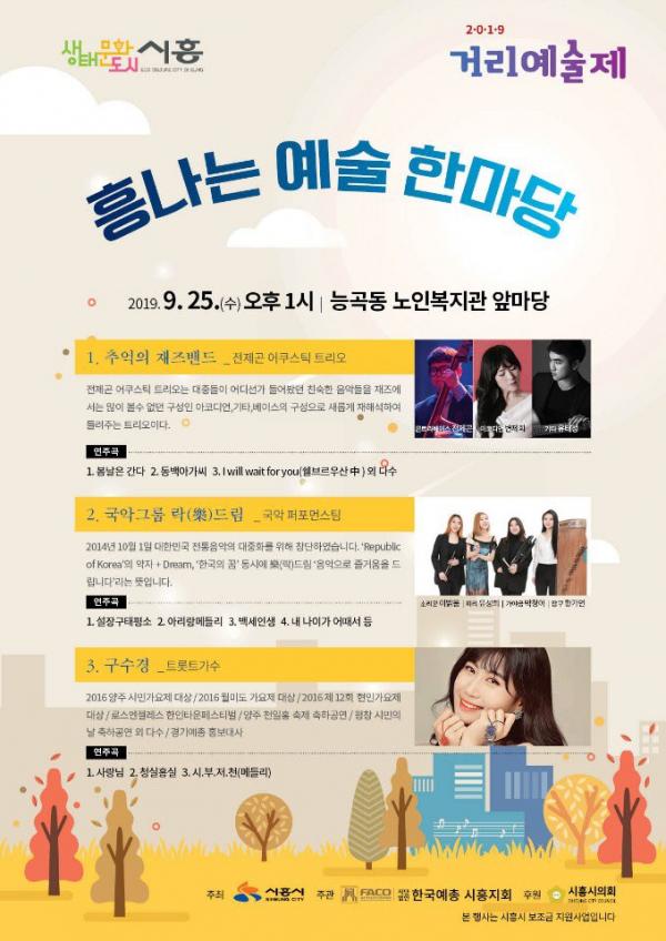 25일 능곡동에서는 진행되는 공연은 아코디언, 기타, 베이스의 구성으로 친숙한 음악들을 새롭게 재해석한 추억의 재즈밴드 무대를 시작으로 우리나라 전통음악을 연주하는 락드림, 트로트가수 구수경의 흥겨운 무대로 ‘흥’이 넘치는 공연을 선사할 예정이다.