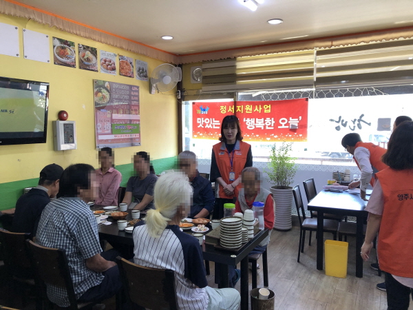 양주시무한돌봄행복센터는 지역 내 저소득 취약계층을 대상으로 분기 1회 외식지원 사업을 실시했다으로써 여가활용과 정서함양의 기회를 제공하는 등 따뜻한 지역사회 분위기를 조성하는데 앞장서고 있다.