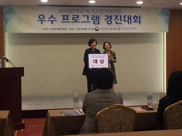 우선 지난 21일 서울 국도호텔에서 여성가족부와 한국청소년상담복지개발원이 주최한 ‘2019 학교 밖 청소년 지원사업 우수프로그램 경진대회’에서 연극동아리인 ‘커뮤니티플레이 학연’으로 대상을 수상했다.