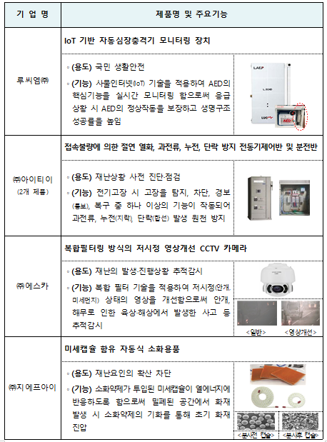 이밖에도 ‘복합필터링 방식의 저시정 영상개선 CCTV 카메라’, ‘소방안전시설 전원공급용 고내화 케이블’, ‘PLA부직포와 니들펀칭 기술을 사용한 토사유실 방지용 식생매트’ 등이 인증을 받았다.
