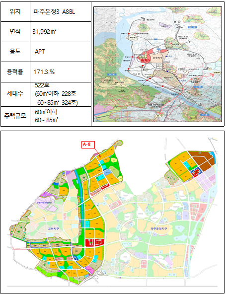 파주운정3 A8 총 31,992㎡의 면적에 전용면적 60㎡이하 공동주택 228호, 60~85㎡ 공동주택 324호, 총 552호를 공급할 수 있다.