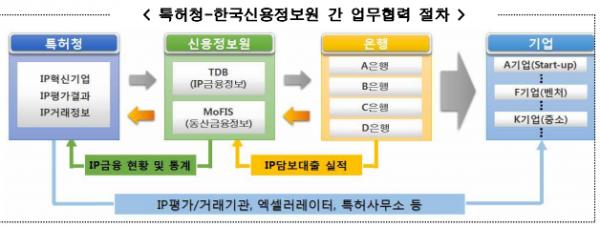 협약의 주요내용으로 특허청은 우수 지식재산 보유기업 정보 등을 신용정보원에 제공, 신용정보원은 특허청이 제공한 지식재산 정보를 은행 등 금융권에 확산, 지식재산 금융 정보시스템 구축 등 기반 조성이다.