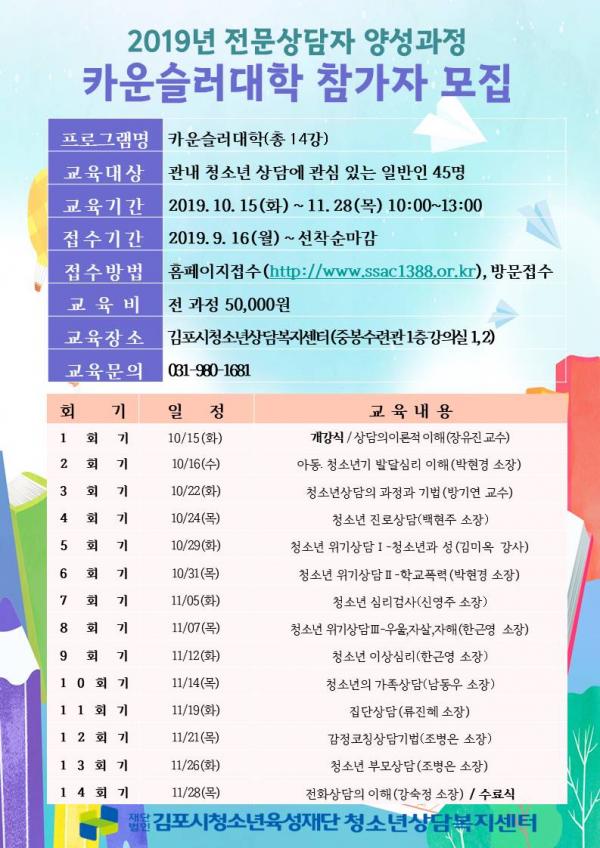 김포시청소년상담복지센터는 지난 2000년부터 매년 ‘카운슬러대학’ 운영을 통해 지역사회 상담인력 양성을 통한 다양한 상담활동을 지원하고 있으며, 일반시민을 대상으로 아동·청소년의 심리발달에 대한 교육을 운영해 세대 간 차이에 대한 이해를 넓히고 청소년 친화적 문화형성에 힘쓰고 있다.