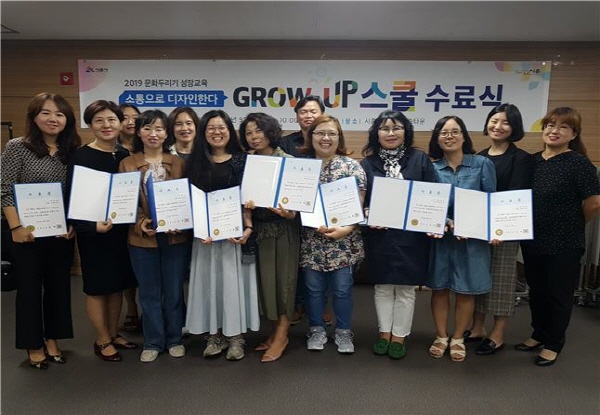 ‘2019 문화두리기 성장교육 Grow-Up 스쿨’은 기존 문화두리기와 문화두리기 활동에 관심이 있는 일반 시민을 대상으로 커뮤니케이션 역량 강화 학습과 공동체 조직 학습을 위한 ‘퍼실리테이션’ 학습과정, ‘디자인’ 학습과정을 운영하며 학습과정에서 협업을 통한 결과물을 도출하는 과정으로 총 8회에 걸쳐 진행됐다. 특히, 이론교육에만 그치는 것이 아니라, 모의토론, 미니 워크숍, 문화두리기 심볼 디자인 등 ‘교육→학습→실행→결과도출’의 체계적인 과정을 통해 소통 및 문화역량 기회를 확대했다.