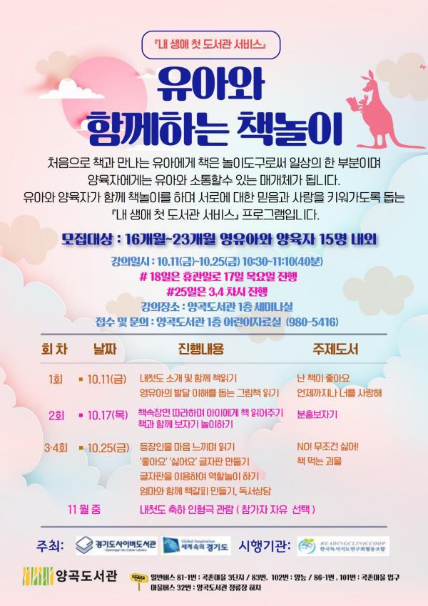 이번 강연은 경기도에서 운영 중인 임산부 및 영유아 대상 무료 택배서비스‘내 생애 첫 도서관 서비스’의 확대 · 연계 프로그램 개발 진행에 참여하는 도서관으로 선정돼 진행되는 프로그램으로 16개월~23개월 유아와 양육자를 대상으로 10시 30분부터 40분간 진행된다.