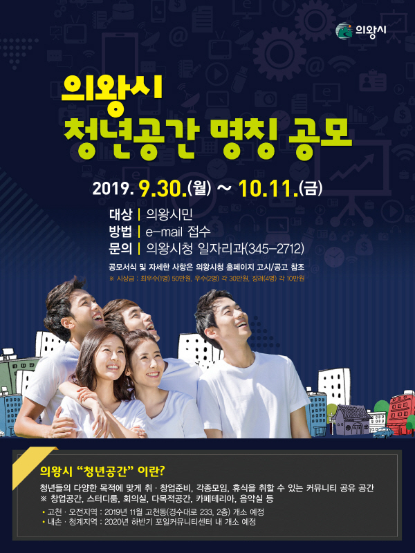 시는 고천동에 조성중인 고천·오전지역 청년공간을 오는 11월말 개소할 예정이며, 2020년 하반기 포일커뮤니티센터 내에 내손·청계지역 청년공간을 추가로 조성할 계획이다.