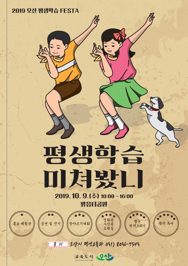 2017년, 2018년에 이어 올해 세 번째로 개최되는 ‘2019 오산 평생학습 FESTA’는 여러 평생교육 기관 및 단체들이 홍보·체험관 부스를 운영하는 ‘평생학습 만나봤니’와 평생학습 동아리 공연 및 성과물 전시인 ‘평생학습 해봤니’, 받아쓰기 대회 및 박 터트리기 등 각종 이벤트 행사인 ‘평생학습 즐겨봤니’로 구성된다.