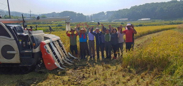 이날 이주희 한농연용인시연합회장과 정기화 모현읍노인회장 등 주민 10여명이 논으로 나와 농민들과 함께 한 해 동안 땀 흘려 가꾼 곡식을 수확하는 기쁨을 나눴다.