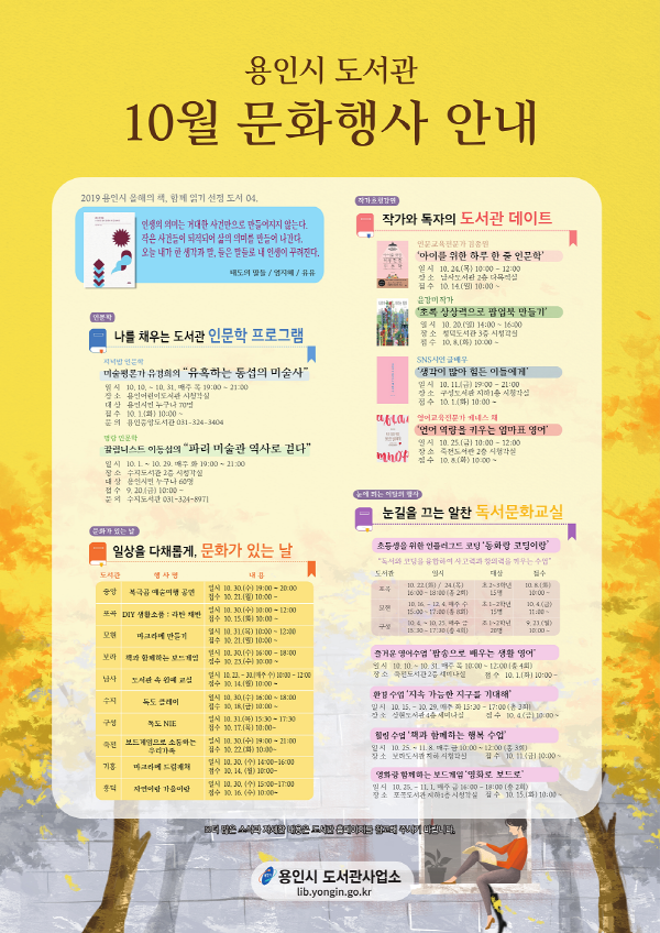 도서관 관계자는 “독서의 계절인 가을을 맞아 다양한 독서문화체험 행사를 마련했으니 온가족이 함께 즐기기 바란다”고 말했다.