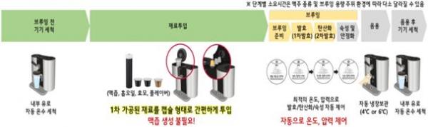캡슐과 물을 넣고 간단한 다이얼 조작만 하면 1~4주 후 자동적으로 5L의 신선한 수제맥주가 만들어지는 수제맥주 제조기기