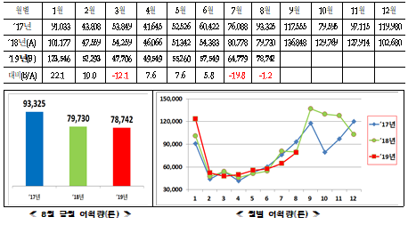 2019년 8월 연근해어업 생산액은 전년보다 11.3% 증가한 3,288억 원으로 집계됐다. 주요 어종별 생산액은 전년보다 오징어가 87%, 꽃게가 76%, 전갱이가 171% 증가했고, 멸치, 갈치, 가자미류는 전년수준을 기록했다. 반면, 참조기는 전년보다 50% 감소하였으며, 고등어도 전년에 비해 43% 감소했다.