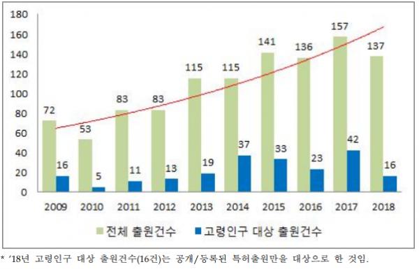 특허청에 따르면, 최근 5년간 재활보조기기의 특허출원은 686건으로, 이전 5년간 출원 건수인 406건에 비해 69% 증가했고, 이 중 고령인구를 대상으로 하는 재활보조기기는 64건에서 151건으로 두 배 이상 급증했다.