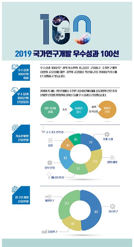 올해는 정부지원을 받아 수행한 약 6만 3천여 과제 중, 각 부·처·청이 추천한 총 949건의 후보성과를 대상으로 산·학·연 전문가들로 구성된 우수성과 선정평가위원회에서 질적 우수성을 평가한 후, 대국민 공개검증을 거쳐 최종 100건의 우수성과를 선정했다.